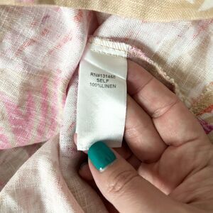 Karlie 100% Linen Top and Skirt Set in Tan with Floral Print. Great used condition with hook slightly loose on skirt. Please review all photos prior to purchase. Top is a size Medium & bottom is a size Large. Please review all measurements for fit prior to purchase.