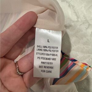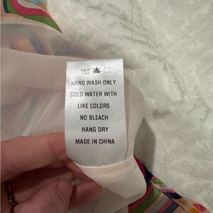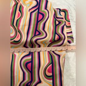 Stylish dress with a swirl pattern. Features pink, green, and cream tones. Ideal for a chic look.