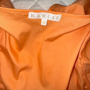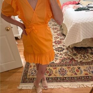 Worn once. Chic mini dress with ruffle accents. Wrap style for a flattering fit. Ideal for any event. More of a peach color in person.