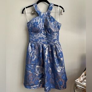 Never been worn! Keyhole chest. Criss cross halter. Shimmery silver and blue.