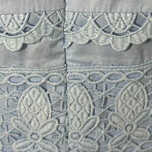 Blue dress adorned with matching lace, NWT. This dress is a beautiful sky blue color, Size Large. It is made of very nice Cotton fabric with a crisp finish. It has a V neck outlined with matching lace like material and has a cotton lining. There is a long zipper in the back going to the waist.