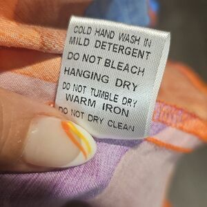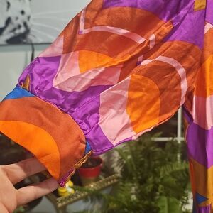 Vibrant and stylish, this dress features a bold geometric pattern in orange, pink, and blue. Perfect for making a statement.