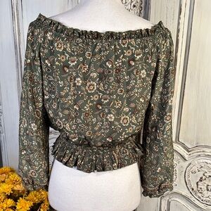 Chic floral green top with a stylish ruffled neckline. Perfect for casual outings or a day at the office.