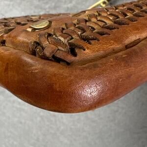 Vintage feel Karma of Charme crossbody purse in rich cognac Italian leather. Features a Braided front, zip closure, and a 30" adjustable drop. Boho style, with a well-loved, broken-in look that adds to its vintage charm.