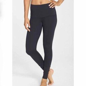 The Karma Yama black leggings are a comfortable fit with a flattering high rise ribbed waist and ribbed ankle for a stylish look. The leg area is fitted but not compression like the waist. A great legging for yoga class or for running errands. In excellent pre-owned condition.