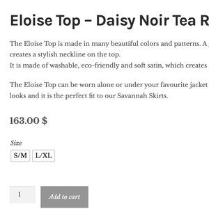 The Eloise Top is made in many beautiful colors and patterns. A gathered ribbon tie creates a stylish neckline on the top.