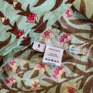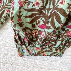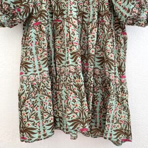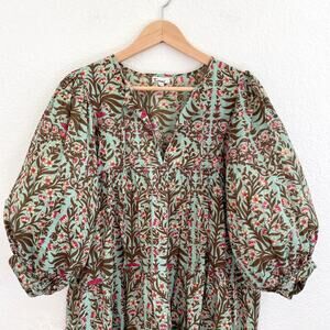 This Karni mini dress blends timeless artisan craftsmanship with breezy boho charm. Made from 100% Indian cotton, this dress is comfortable, lightweight and breathable. It features a vintage-inspired green, pink, and aquamarine hand block print floral pattern and a flowy tiered silhouette that flatters all body types. The relaxed prairie style is elevated with a soft V-split neckline that has an optional tie closure. Voluminous 3/4 balloon sleeves with double-button adjustable cuffs add a romantic touch and refined detail.