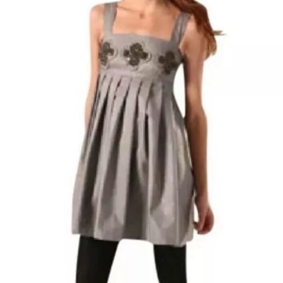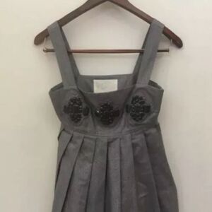 Features: Pleated skirt, floral embellishments, wide straps, square neckline