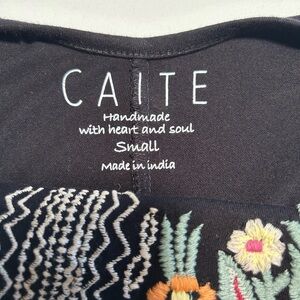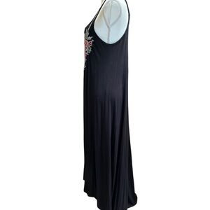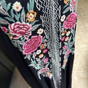 Elegant black maxi dress with vibrant floral embroidery. Features pink, green, and white accents. Hi low size Small. Pit to pit 16 1/2” with lots of stretch