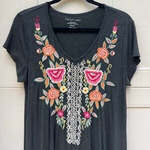 Karyn Seo Floral Embroidered Short Sleeve Short Dress Charcoal Grey Size Small