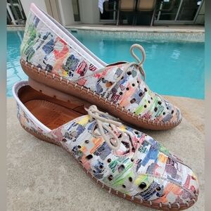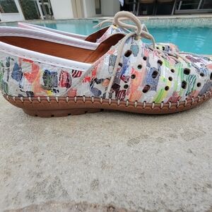 Karyoka womens comfort/walking shoes 100% leather in a color splash pattern. Karyoka is the comfort expert in women's walking shoes. Made is Turkey. Designed with breathable casual footwear in mind, these feature flexible soles that adapt to your every step. Whether your enjoying a leisurely walk or transitioning from work to a weekend outing, these comfortable shoes ensure your feet remain cushioned and supported throughout the day. These are in excellent pre owned condition and go with everything.