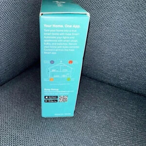 This is a new, unopened Kasa Smart Wi-Fi Light Switch, single pole, model HS200. The switch is compatible with Amazon Alexa, Google Assistant, and SmartThings. It features a white plastic faceplate with a single rocker switch and a small LED indicator light. The box is in good condition with no visible damage or wear. The switch is designed for easy installation and allows for voice control, scheduling, and remote access. The box includes a sticker indicating that the product is Amazon Renewed, meaning it has been inspected and certified to work like new. The box also includes a sticker with a barcode and the product's serial number.