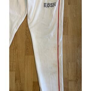 Set is priced cheap because there are marks/stains. May come out with proper cleaning. I haven’t tried to wash it. No rips or holes. Zipper jacket. Drawstring pants with pockets and zippers at ankles.