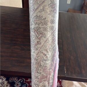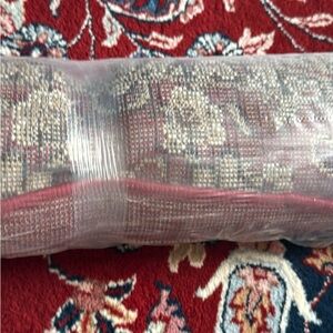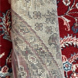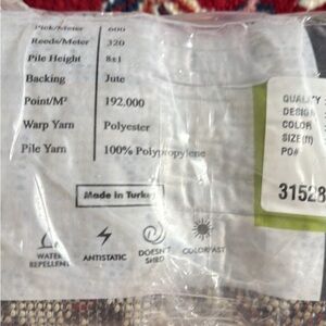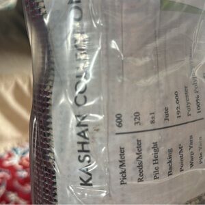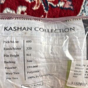 Kashan Collection rug label visible. Main colors are red with accents of navy and cream. Traditional pattern and rich tones.