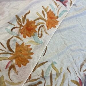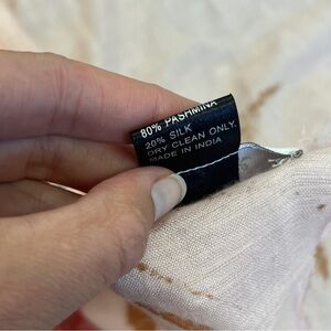 Beautiful painted Pashmina and Silk scarf / wrap by Kashmere. Dry clean only. Lightweight singly ply, semi sheer. Designs feel painted on. Beautiful accent to add elegant intrest to any look