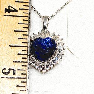 This stunning necklace boasts a captivating gemstone heart surrounded by a halo of shimmering moissanites. With a length of 20 inches, this necklace is perfect for evening or daytime wear and it sports a very rare gem whose cost as a loose stone is worth the price being charged for this item! Just Google Kashmir Blue Kyanite and see for yourself!
