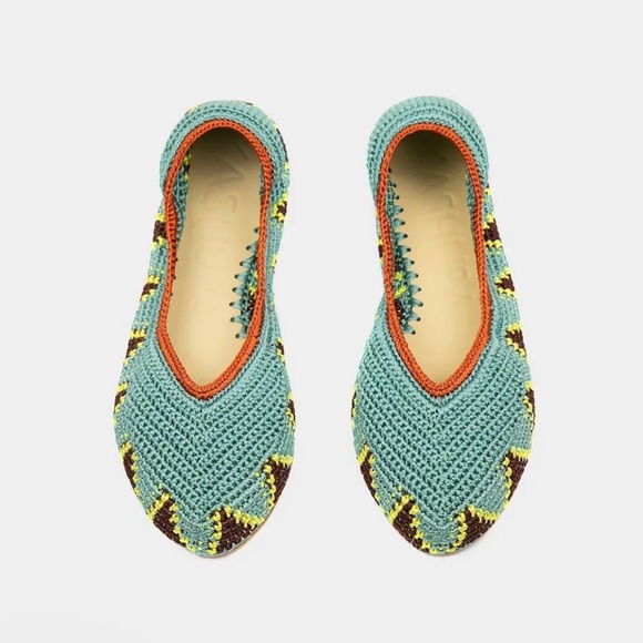 These unique flats feature a crochet upper in teal green with yellow, brown, and rust detailing. Beautifully crafted, lightweight, and breathable — perfect for warm weather or indoor lounging. Gently worn and in great condition. A standout artisanal piece with comfort and style.