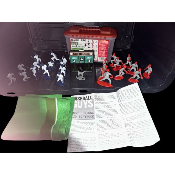 For sale is a complete set of Kaskey Kids Baseball Guys action figures. This 30-piece set includes players in red and white, a fabric field, and a scoreboard. The figures and accessories are made of plastic and the set comes in its original box.