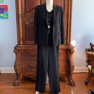 Beautiful, Classy and professional pant suit. Black Pinstripe- Jacket, v neck shell and relaxed fit pants. All 3 pieces are fully lined.