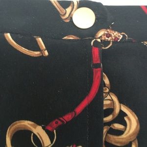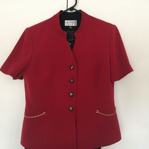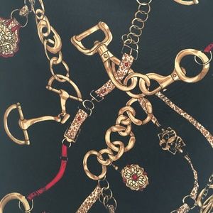 Jacket is fully lined in black. Bust is 40 inch Neck to hem in back is 21 inches. Chain trim highlights chain pattern in skirt