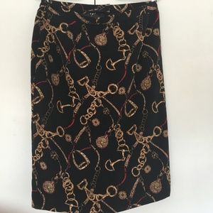 Skirt has full black lining. Skirt has 7 inch zipper in back . Skirt waist is 30 inches. Waist to hem is 22 inches.