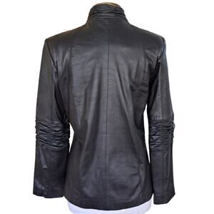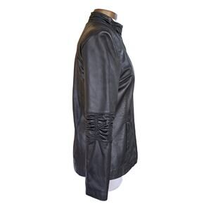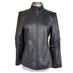Kasper Black Leather Jacket Size Small Stand Collar Ruched Sleeves Moto Cafe
