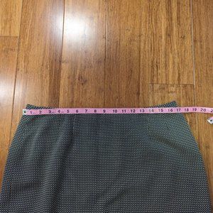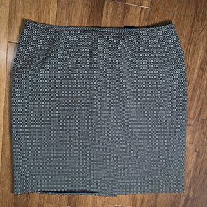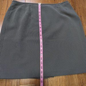 Kasper Black/White Print Pencil Skirt. Size 16. Polyester. Color - Black with small "T's" on it - sort of like checked or houndstooth. The second picture shows the fabric prety well. Dry Clean. Rear Slit. Zipper/hook closure. Fully lined. See pics for measurements.