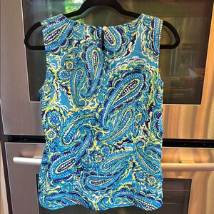 This Kasper blouse features a vibrant blue paisley pattern, perfect for a casual summer day. The sleeveless design and lightweight fabric ensure comfort in warm weather, while the rounded neckline adds a touch of elegance. So lightweight and flowy!:)