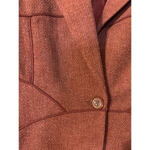 This suit jacket/blazer and skirt suit set is from Kasper in a women's size 10. "Antique Red" which is burnt orange in color. There are natural slubs in the boucle fabric. Fully lined, made of polyester.