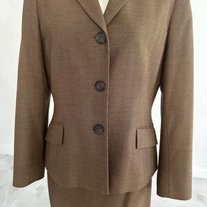 Elevate your professional wardrobe with this timeless brown herringbone skirt suit. The structured blazer features a notched lapel collar, three-button front closure, and flap pockets for a polished silhouette. The coordinating skirt falls below the knee and includes subtle pleat detailing for added movement and elegance.