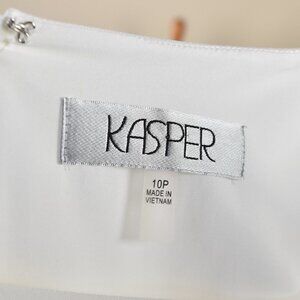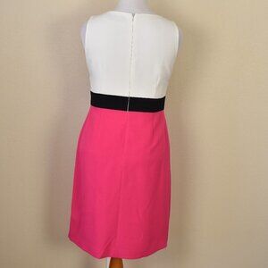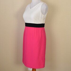 Kasper color block sheath dress. Size 10 PETITE. White/off-white, black, and pink. Fully lined. Back zipper/ Sleeveless. V-neck. Dress does not have a yellow tinge, just poor lighting. Excellent condition! 97% polyester 3% elastane Measurements laying flat: Bust (armpit to armpit): 19.5" Waist: 16.75" Hips: 21.5" Bottom hem width: 22" Total length (top of shoulder to bottom hem): 37.5"