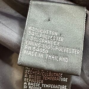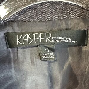 Kasper women's denim blazer is a two-button, dark blue denim jacket with light-colored contrast topstitching. The blazer features a notched lapel and flap pockets. It is a structured and tailored piece, often made from a cotton blend, and is typically worn for a business-casual or smart-casual look. Some descriptions also mention that it is lined and may have shoulder pads.