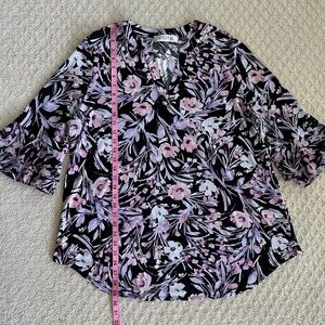 Kasper Floral Print Bell Sleeve Blouse/Top Split Neck - Black/Pink/Lavender - Size 1X - Office/Career. Add some style to your workweek look with this Kasper 3/4 sleeve top, strewn with colorful flowers for a fresh touch. Features a split neckline, 3/4 length bell sleeves, soft and stretchy fabric, and easy pullover styling. Perfect for lunch, brunch, or the office. Excellent pre-owned condition!
