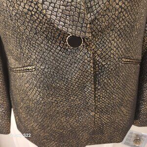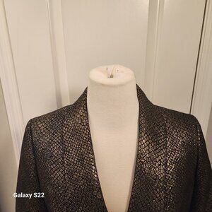 Kasper Gold/Black Blazer. NWT. Size MP. No rips/stains/tears/pulls. Perfect. Gold shimmer over black, so lovely. Faux pockets. Fully lined. Single button comes with extra button. Built in shoulder pads for a crisp look, not big and bulky. Material: Poly/Metallic/Cotton blend. Measurements: Pit to Pit: 18.5 inches. At waist with button closed: 17 inches. Top of shoulder to bottom: 25.5 inches. Smoke free home. No odors. All offers are welcome. Thank you!