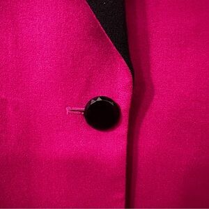 Wide black lapels adding a formal element to the design against the vibrant magenta color