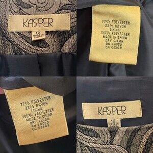 Kasper Metallic Gold Black Blazer Top 3pc Pantsuit Set. Jacket and sleveless top have beautiful metallic gold floral design. Jacket has no closure in front and has a detachable intricate black brooch pin. Sleveless top has side hidden zipper colsure and small slit design on sides. Pants are black and have side hidden closure zipper, clasp and button. See sizes below and photos for different size details.