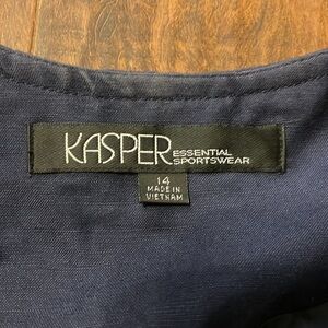 Kasper Navy Linen Blend Plus Size Blazer w/Large Buttons, Sz. 14. This blazer has a four-button closure with long sleeves and is fully lined. One of top color suggestions for women to own in their closet (black, white, navy and gray), this blazer whispers quiet luxury. It blends classic style with modern trends, offering a seamless addition to your sophisticated wardrobe. A solid luxury designer, Kasper items are meant to endure and this classy and elegant piece has a lot more life left. Great pre-owned condition that looks to hardly have been worn. An excellent addition to any closet.