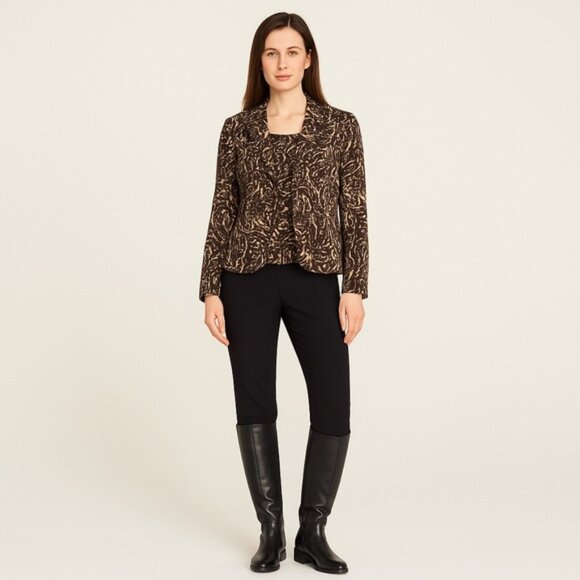 Luxurious Kasper two-piece pure silk set featuring a tailored single-button blazer with structured shoulders and a coordinating sleeveless camisole. The rich brown, black, and cream abstract pattern creates a chic statement look while maintaining timeless sophistication. Perfect for the office, formal dinners, or paired separately for elevated styling. Wear together for a coordinated professional outfit or mix into your capsule wardrobe for versatile day-to-night dressing. Great pre-owned condition, see the pictures.
