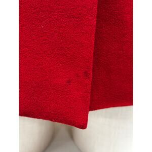 Vintage Asian-inspired Mandarin collard red short blazer from Kasper. Sized a 14P, runs a bit small, best fits about a 10/12. Has gold buttons down the front (one is a little loose). Has light shoulder pads and a very distinctive design. Does have some slight staining in the front (see photos). I've used an at home dry cleaning kit on this, but not taken it to an actual cleaners. It's 100% wool with a poly liner. Structurally in excellent shape.