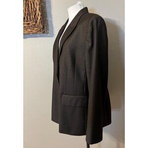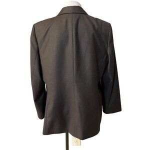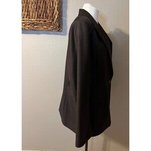 This suit jacket/blazer is from Kasper Separates in a women's size 18. Solid dark brown in color. Fully lined in polyester. Made of 85% polyester and 15% rayon. Single brown button on the front. Has no buttons on the sleeves. Pockets have overflaps and are still sewn shut.