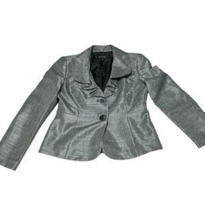 Elegant preloved skirt suit featuring a blazer and skirt. The blazer has a two-button closure, a ruffled collar, and a tailored fit. The skirt is a classic pencil style with a back slit. The suit has a metallic silver finish, adding a touch of sophistication and glamour to the ensemble. The interior of the blazer is fully lined.
