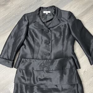 The Kasper Skirt Suit in black is a vintage-inspired women's outfit designed for petite sizes. Made from polyester, this original suit features a classic skirt and jacket set in a sleek and sophisticated style, perfect for a secretary or geek-inspired look. The brand, Kasper, known for its quality and timeless designs, offers a unique and stylish option for those looking to add a vintage touch to their wardrobe. Made in Vietnam, this skirt suit is a versatile and fashionable choice for any occasion.