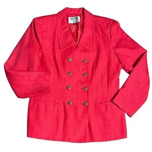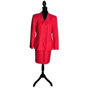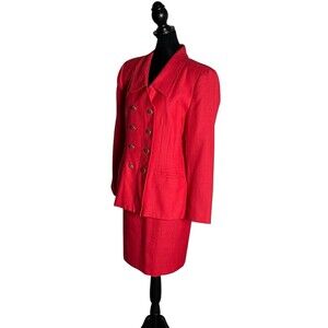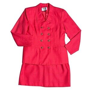 Elevate your professional wardrobe with the Kasper Skirt Suit, a quintessential ensemble for the modern petite woman. The suit comprises a sophisticated red jacket in a size 10P with a timeless double-breasted design and a skirt in a corresponding size, ensuring a polished and tailored silhouette. With its lightweight polyester rayon blend fabric, this skirt suit promises both comfort and durability, perfect for long days at the office or evening events.