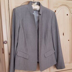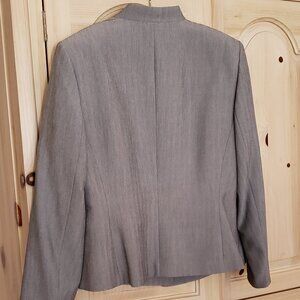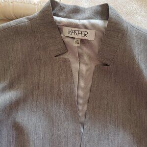 Classic Kasper stand notch collar jacket, in soft gray color. Detailed with princess seaming, open front, lined, with slightly padded shoulders.