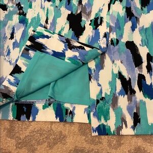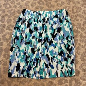 Elevate your workwear with this stunning Kasper pencil skirt. Featuring a teal, white, and black watercolor-inspired print, this skirt brings a pop of color while maintaining a polished, professional look. Fully lined for comfort and structure, with a back zipper and hook-and-eye closure for a tailored fit.