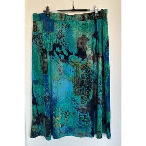 DETAILS: Women's size XL skirt. Knee length. Turquoise blue, black and hints of gold color. Flare, flowy fit. Unlined. Pull on style. Elastic waist.