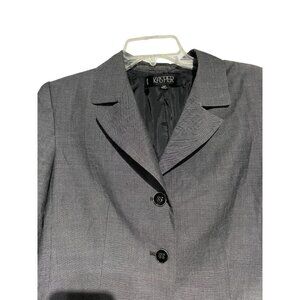 A sophisticated gray blazer designed for career-driven women. Features include a double front pocket layout, ideal for business or formal settings. Crafted by Kasper, it ensures a flattering fit in size 14P.