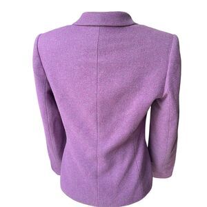 The Kasper Women's Blazer in a wool blend fabric, featuring a zip collar and a purple color, is a stylish and versatile piece perfect for office attire. This suit jacket/blazer is designed for a size 6 fit, with a notch lapel style and lined interior. Suitable for business occasions in winter, fall, and spring seasons, this classic blazer from the brand Kasper is a great addition to any woman's wardrobe. Made with durable knit fabric and a satin lining, this blazer requires dry clean only to maintain its quality.