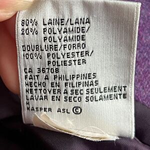 The Kasper Women's Blazer in a wool blend fabric, featuring a zip collar and a purple color, is a stylish and versatile piece perfect for office attire. This suit jacket/blazer is designed for a size 6 fit, with a notch lapel style and lined interior. Suitable for business occasions in winter, fall, and spring seasons, this classic blazer from the brand Kasper is a great addition to any woman's wardrobe. Made with durable knit fabric and a satin lining, this blazer requires dry clean only to maintain its quality.