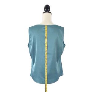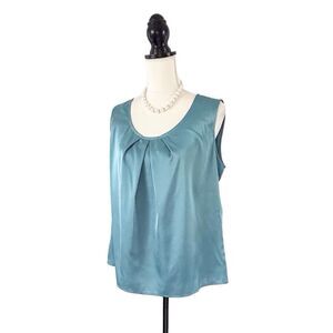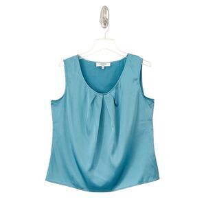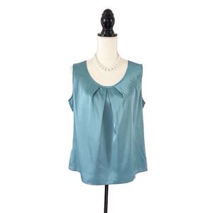 Description: Women’s Blue Green Sleeveless Pleated Scoop Neck Tank by Kasper. Blue green satiny fabric. Versatile top that looks great with a grey, black, or tan skirt or trousers. Works well on its own or under a blazer. Comes from a smoke free home.
